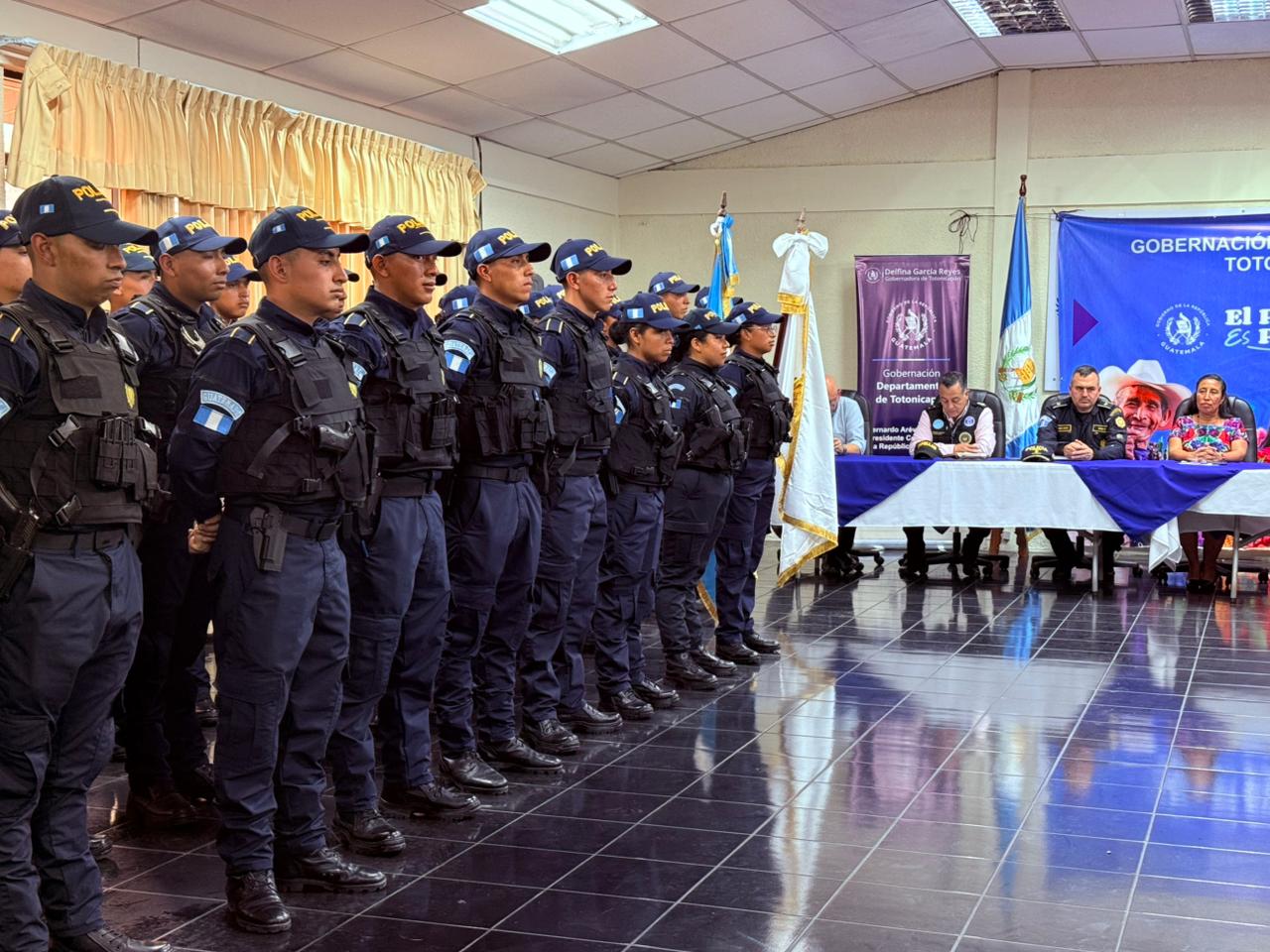 La jornada de bienvenida se desarrolló en dos momentos significativos. El primero tuvo lugar en la sede de la Gobernación Departamental de Totonicapán, donde la gobernadora recibió oficialmente a los nuevos agentes, 82 hombres y 18 mujeres, junto al subcomisario Santos Baudilio Reyes Ruiz, jefe interino de la Comisaría 44.