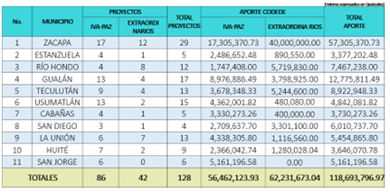 Estos recursos se invertirán en los proyectos que se prioricen en las comunidades quienes lo envían al Consejo Municipal de Desarrollo (Comude) para su aprobación, después es enviado al Codede, posteriormente al Consejo Regional de Desarrollo Urbano y Rural (Coredur) y al Consejo Nacional de Desarrollo Urbano y Rural (Conadur), para que después esos proyectos sean aprobados y finalmente puedan ser ejecutados.