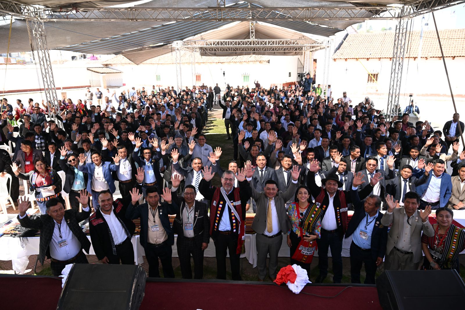 El presidente Bernardo Arévalo, juento funcionarios, autoridades indígenas y vecinos de Santa María Chiquimula, luego de la firma de la agenda de desarrolo local.