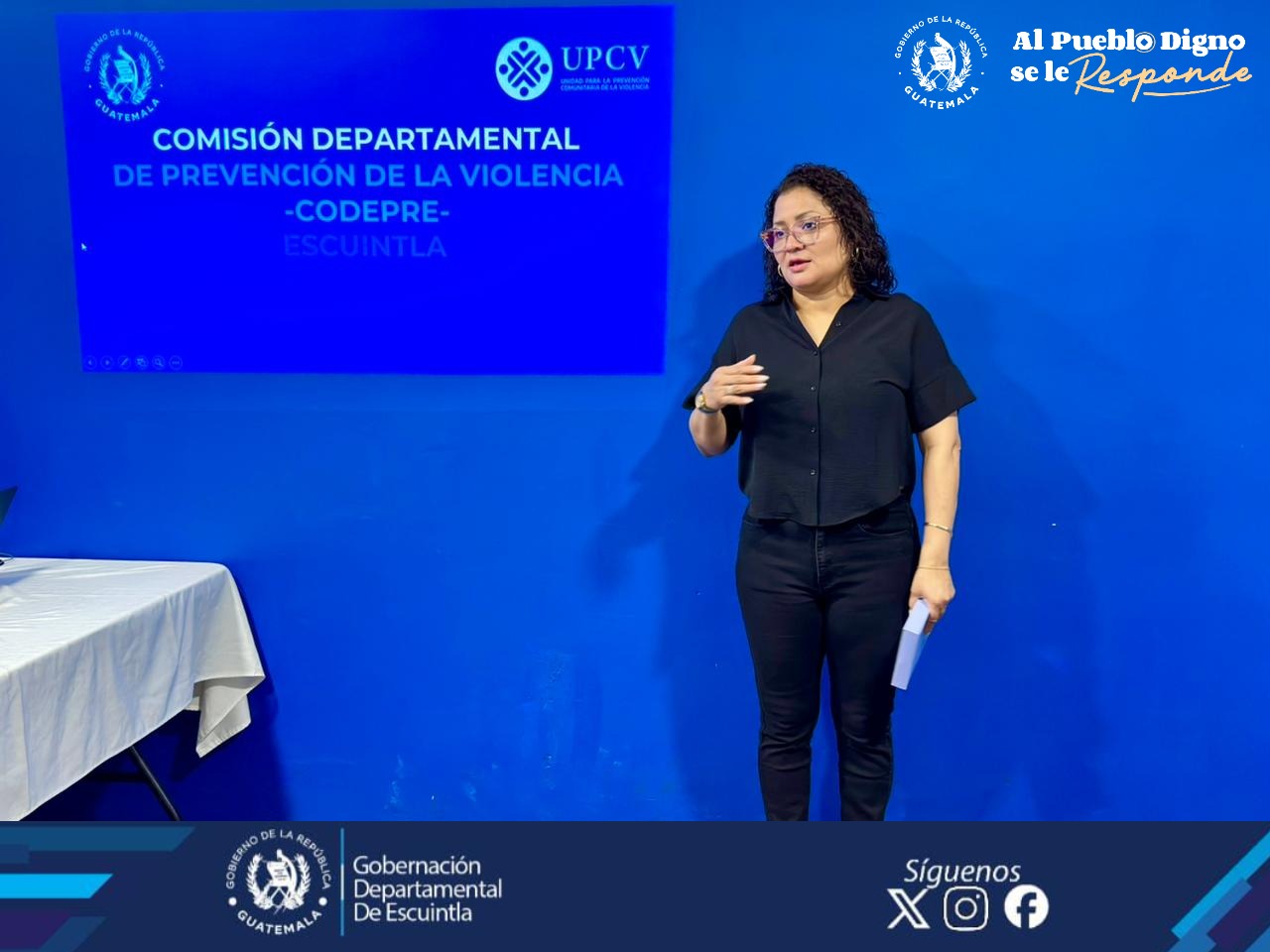Escuintla, 16 abril (AGN). – Con el objetivo de coordinar esfuerzos interinstitucionales para garantizar la seguridad ciudadana y la convivencia pacífica, la gobernadora de Escuintla, Vivian Mayorga, presidió la cuarta reunión ordinaria de la Comisión Departamental de Prevención de la Violencia y el Delito (Codepre).