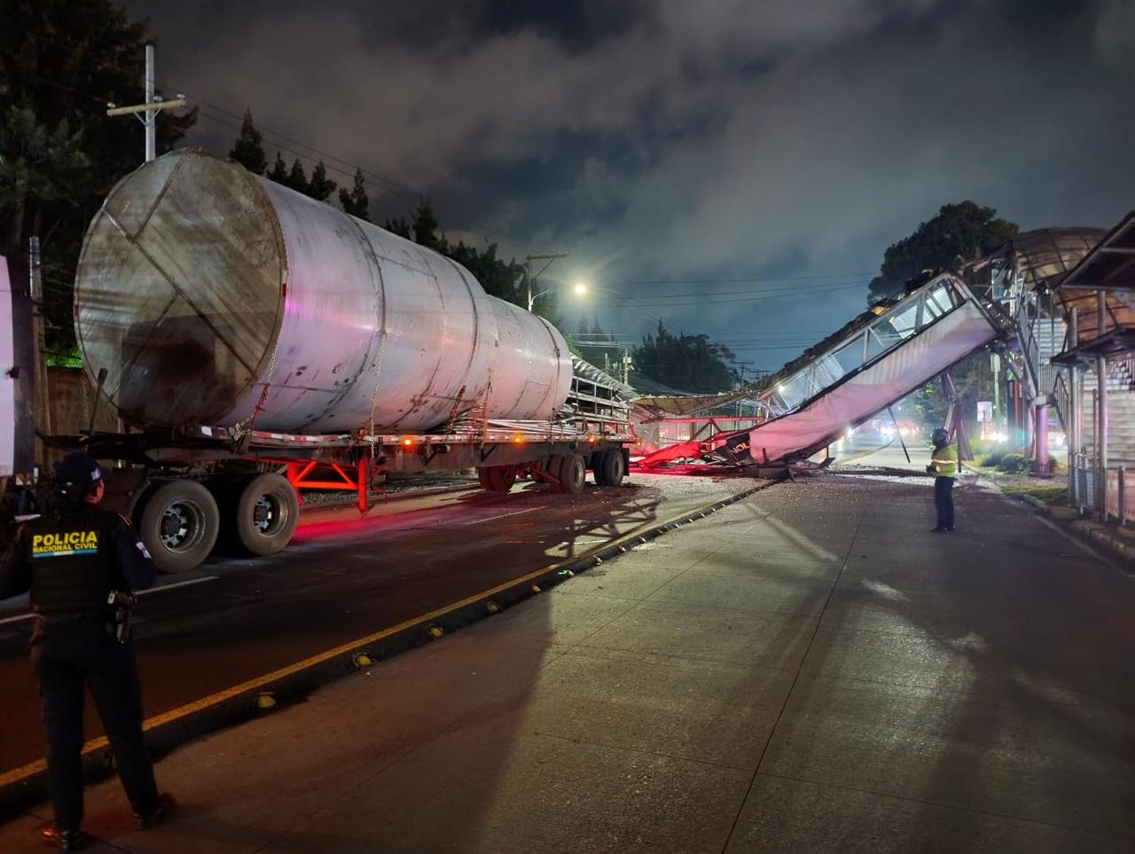 El vehículo impactó la estructura frente al Liceo Javier, en el punto conocido como Parada Javier, lo que ocasionó que la pasarela cayera sobre la vía. Estamos trabajando en coordinación con la PMT de la Ciudad de Guatemala para habilitar un carril reversible y permitir el paso hacia la capital.