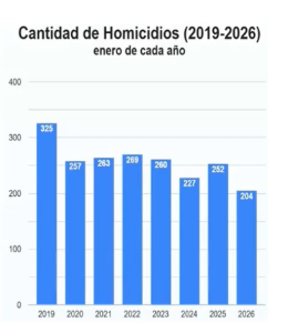 De acuerdo con el reporte, el país registró 204 homicidios, la cifra más baja observada en un mes de enero en al menos los últimos ocho años y menor a cualquier mes contabilizado en 2025.