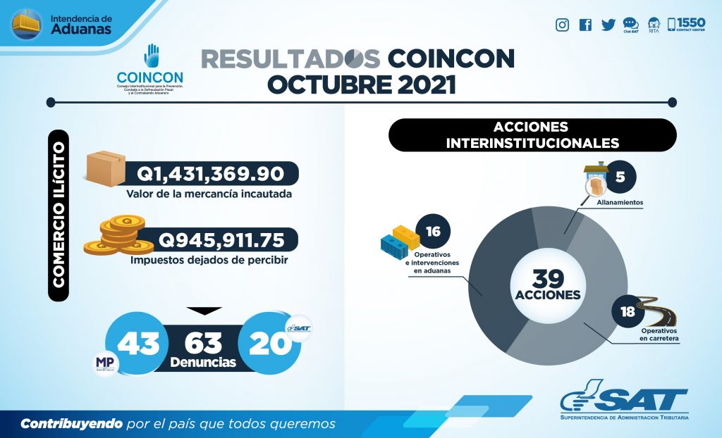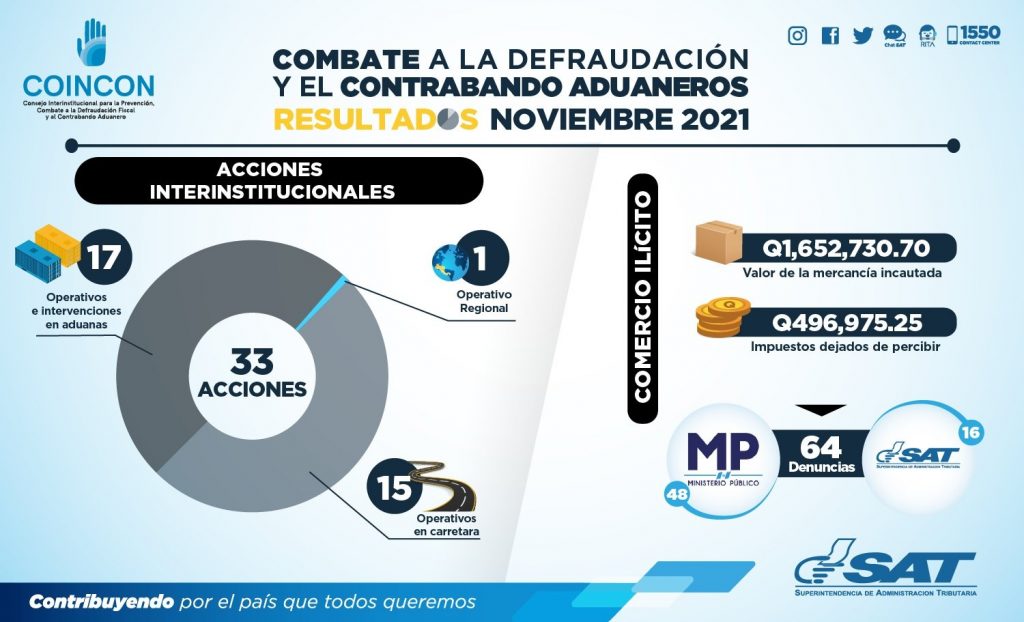 La Superintendencia de Administración Tributaria (SAT) informó que entre enero y noviembre se efectuaron 505 operativos, tanto en carreteras como en locales comerciales y aduanas. Esto permitió confiscar productos que ingresaron de manera irregular en el país.