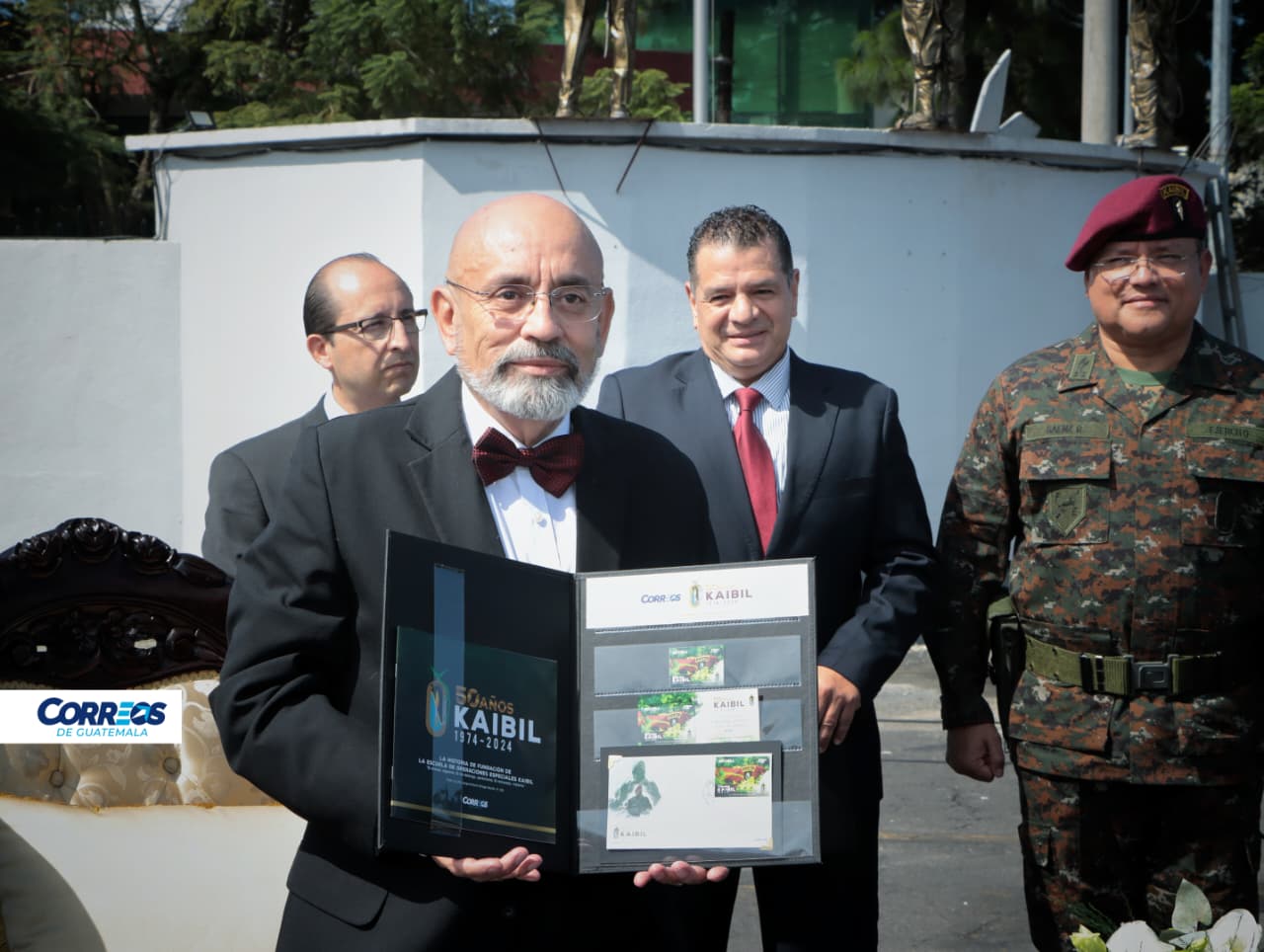 Presentan sellos postales alusivos a los 50 años de las fuerzas Kaibil del Ejército de Guatemala. / Foto: Correos de Guatemala.