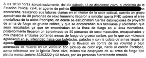 Poco después, llegaron aproximadamente 50 hombres encapuchados, con chalecos antibalas y armas largas, quienes agredieron físicamente a un agente de la PNC, lo golpearon y lo obligaron, bajo amenazas de muerte, a subir a un vehículo. Durante este hecho, le quitaron su arma de fuego.