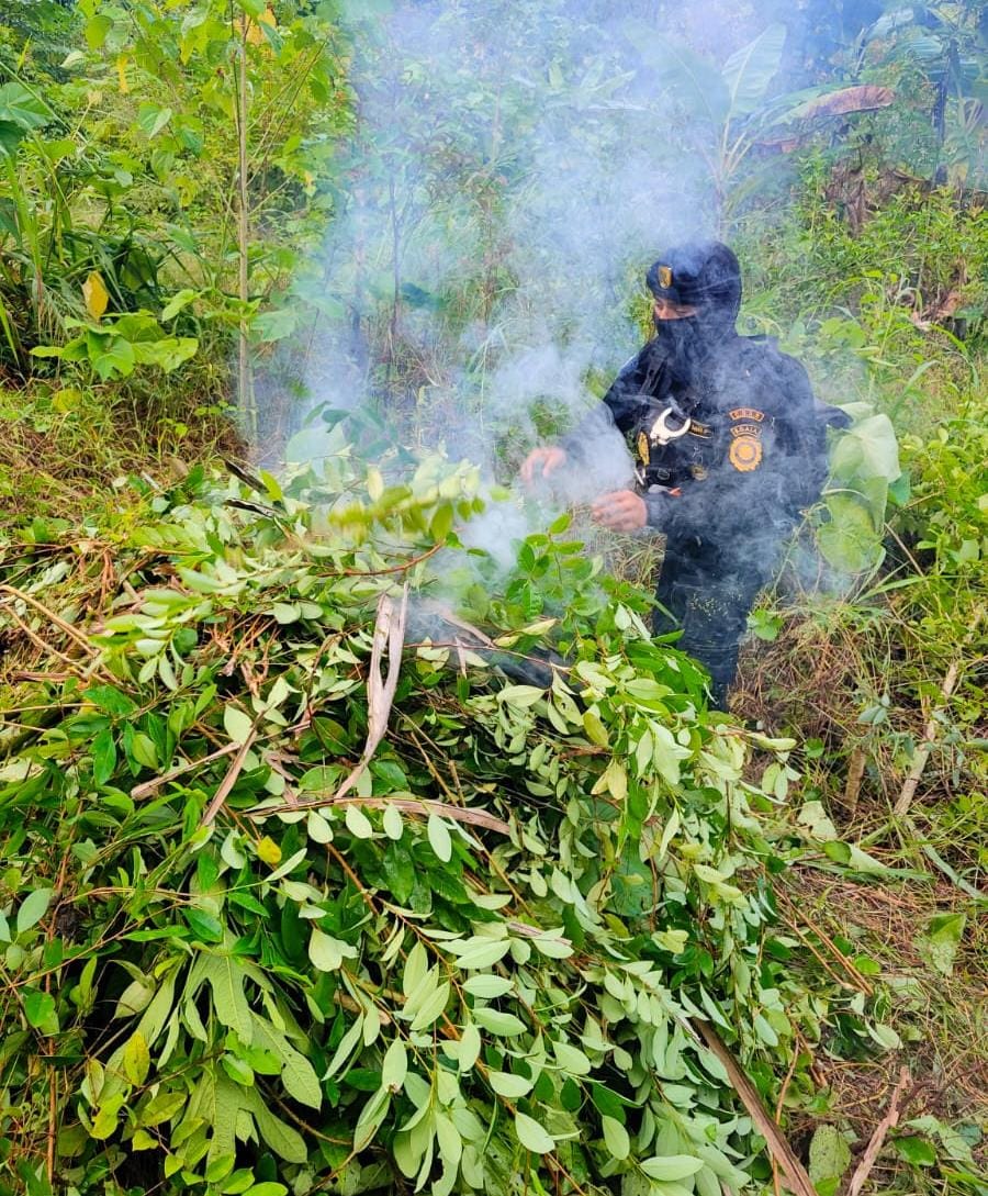 Policías de la #SGAIA reportan que en áreas montañosas aledañas a Melchor de Mencos, Petén, localizaron un campo con más 4,400 arbustos de hoja de coca, que fueron erradicados.