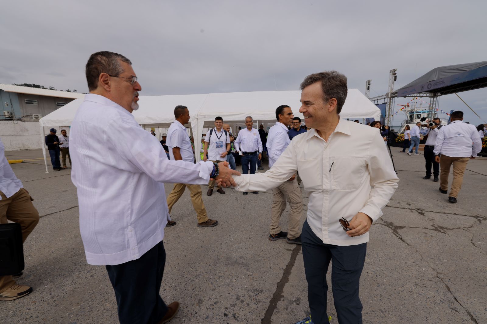 El presidente Bernardo Arévalo saluda al encargado de negocios de la Embajada de Estados Unidos, John Barrett, durante el acto del miércoles en el puerto Santo Tomás de Castilla.