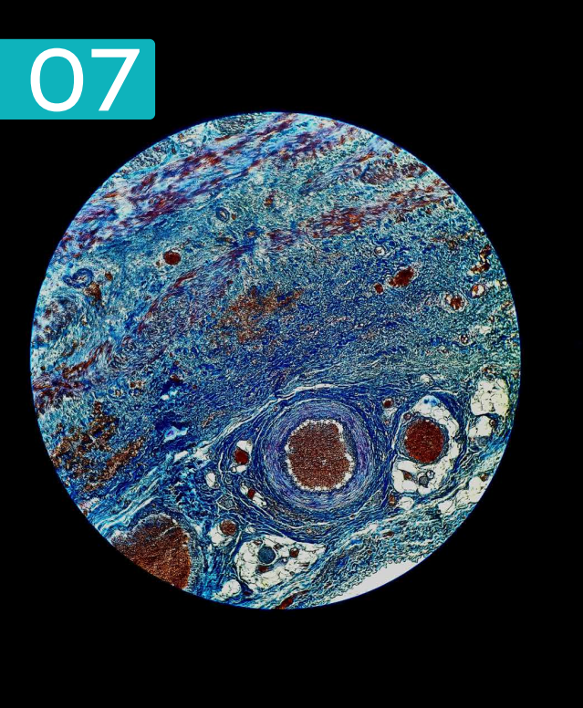 Paralelismo celular y astronómico (Luisa Fernanda Jiménez): Revela un conjunto de tejidos bajo una técnica de tinción, donde se distinguen elementos del tejido conectivo y del sistema nervioso periférico.
