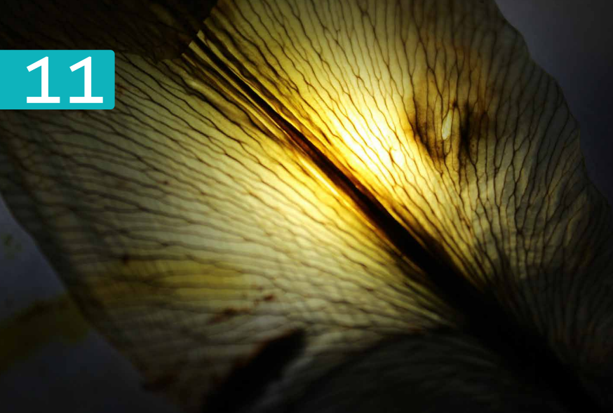 Lirio a Contraluz (Mayra Sofía Lix): Esta es una de las cinco hojas de un lirio, resultado de un proceso de secado natural que ha conservado su tenue tono amarillo. Es un objeto de dualidades: frágil y delicado al tacto, pero a la vez resistente en su anatomía.