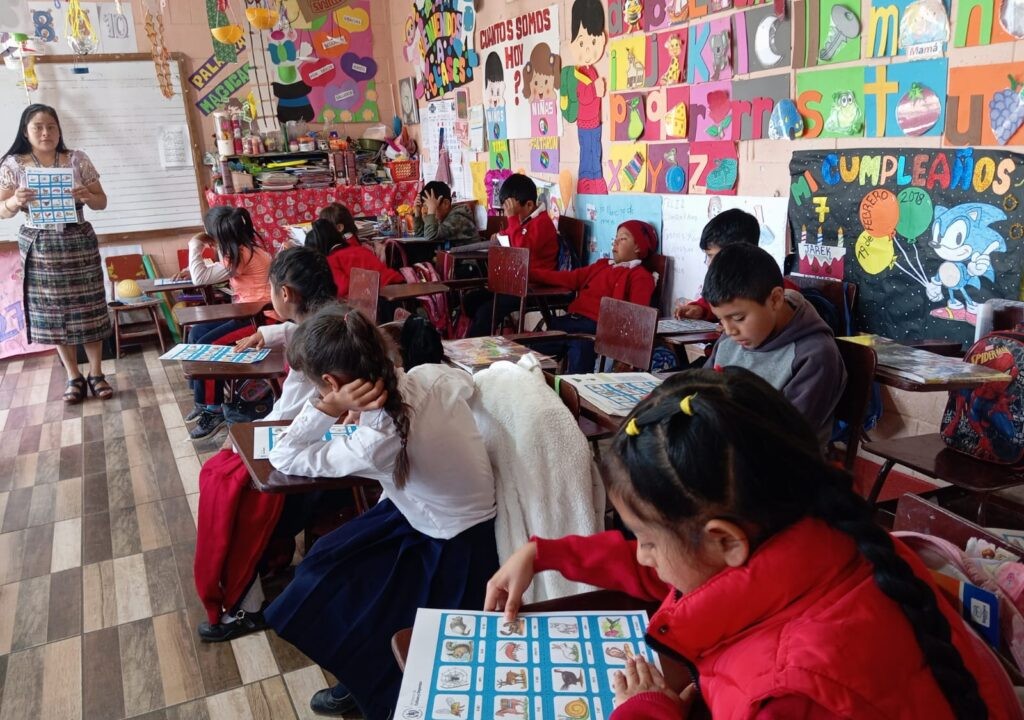 Durante la jornada, los pequeños se adentraron en el mundo de la fauna local utilizando tarjetas ilustradas y repitiendo nombres de animales en k’iche’.