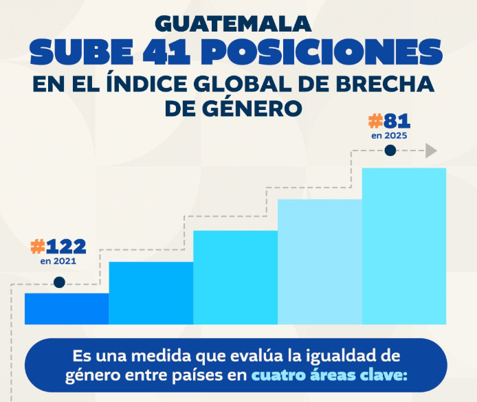 Guatemala sube 41 posiciones en el Índice Global de Brecha de Género, mejorando del puesto 122 al 81.  El Gobierno de Guatemala está trabajando por un país más inclusivo, seguro y justo para todas y todos.