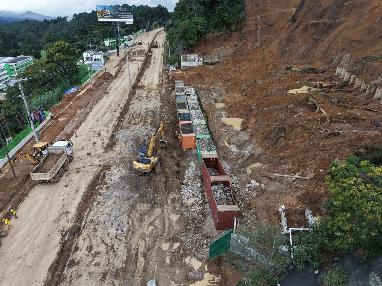 Ciudad de Guatemala, 14 oct. (AGN).- El Ministerio de Comunicaciones, Infraestructura y Vivienda (CIV) informó que la atención de la emergencia en el kilómetro 24 de la carretera a El Salvador no se detiene. Y este día finalizó la instalación de nueve contenedores como una barrera de contención provisional.
