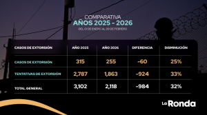 Villeda también informó que, al comparar las cifras con el año 2025, se registra una reducción del 32% en las extorsiones durante el estado de sitio. Este resultado, explicó, está vinculado al control de los centros penitenciarios y a la restricción de las comunicaciones de los privados de libertad con el exterior.