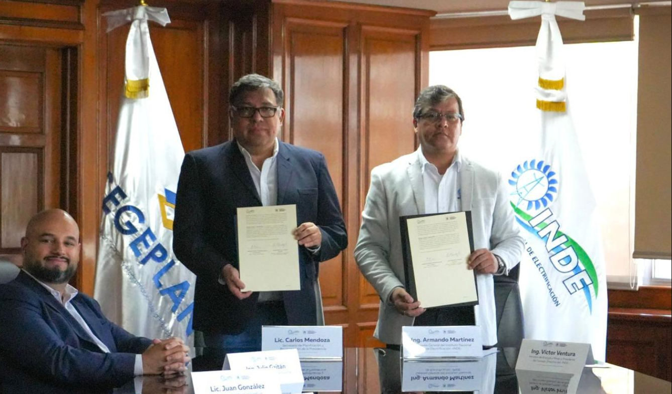 Dicho convenio fue firmado por las autoridades de ambas entidades: Armando Roberto Martínez Aguilar, gerente general del INDE, y Carlos Antonio Mendoza Alvarado, secretario de Segeplan.