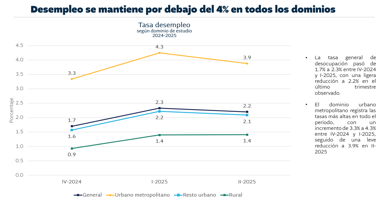 Mientras, el área urbana metropolitana registra las tasas más altas en todo el período, con un incremento de 3.3 % a 4.3 % entre 2024 y 2025, seguido de una leve reducción a 3.9 % en 2025.