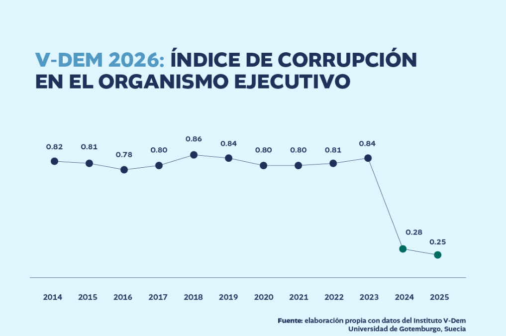 En un drástico descenso, el índice de corrupción puntea con 0.28 y 0.25 al Organismo Ejecutivo en los años 2024 y 2025, respectivamente. Los datos se basan en una escala en la que el cero representa la menor corrupción y uno la mayor.