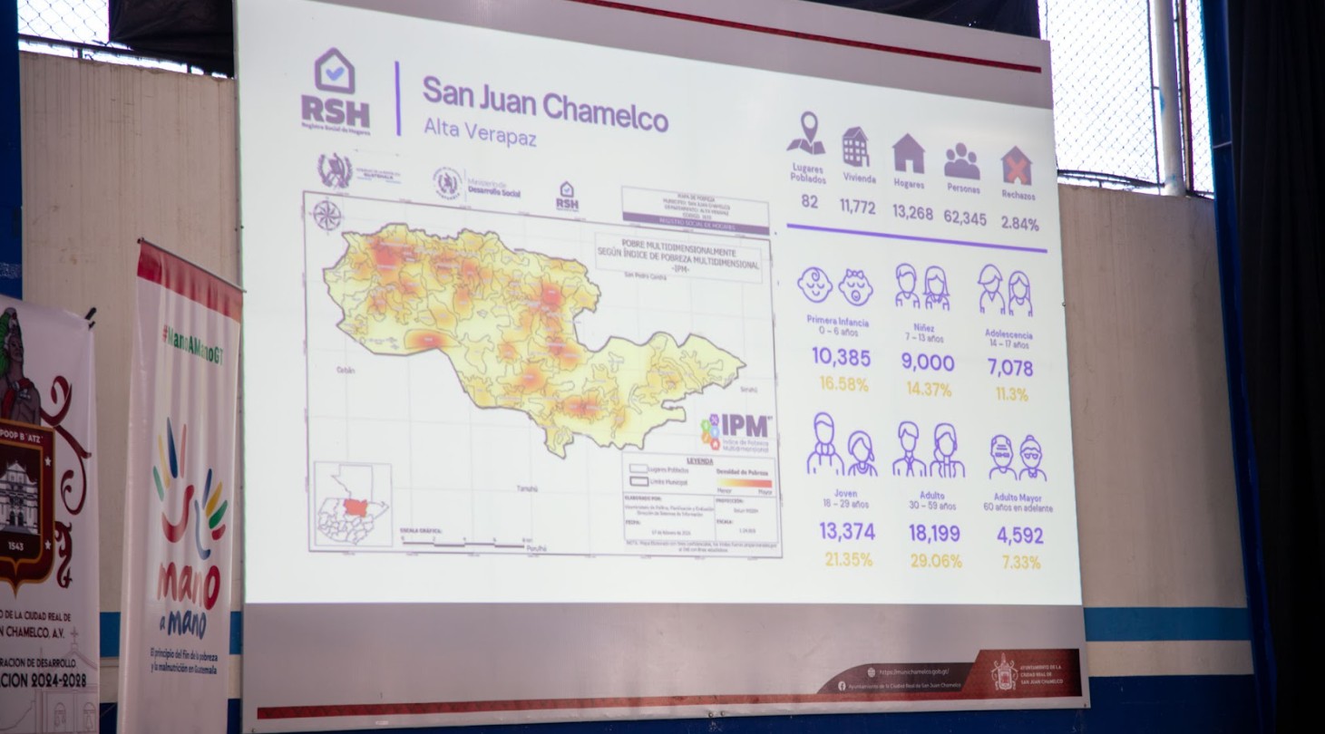 Según los datos socializados, San Juan Chamelco registra 82 lugares poblados, 11 mil 772 viviendas. También 13 mil 268 hogares y 62 mil 345 personas caracterizadas. Esta información es clave para la planificación de acciones en materia de desarrollo social y seguridad alimentaria.