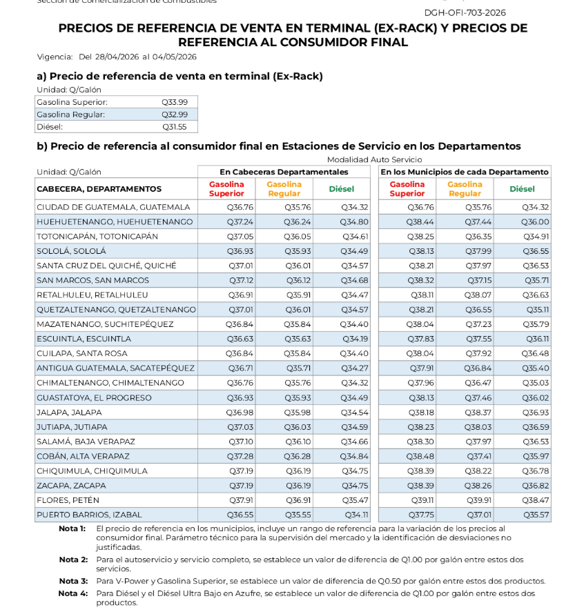 Los precios de referencia se encuentran en una tabla que detalla el costo de venta de diésel y gasolinas regular y superior en cada cabecera departamental, así como en los municipios de cada uno de los departamentos del país.