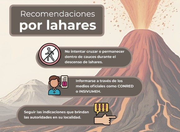 Las autoridades recuerdan informar a las comunidades sobre los peligros de intentar cruzar o permanecer dentro de estos cauces durante el descenso de lahares, asimismo tomar en cuenta que debido a las lluvias, pueden descender más lahares en esta y otras barrancas del volcán de Fuego.