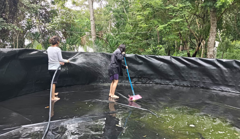Durante la jornada se ejecutaron labores esenciales para mantener la salud de los cultivos, incluyendo la cosecha parcial de peces, la limpieza y la desinfección del estanque. Estas medidas contribuyen a conservar condiciones sanitarias óptimas, reducir riesgos de enfermedades y garantizar un ambiente adecuado para el desarrollo de las especies.