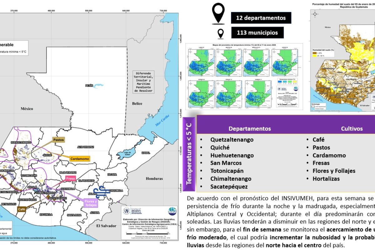 Mediante el Sistema de Información Geográfica, el MAGA ha identificado que en departamentos como Quetzaltenango, Quiché, Huehuetenango, San Marcos, Totonicapán, Chimaltenango y Sacatepéquez se desarrollan cultivos de café, pastos, cardamomo, fresas, flores, follajes y hortalizas, los cuales son particularmente sensibles a las bajas temperaturas.