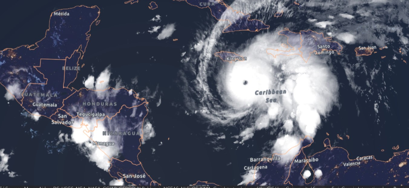 El ojo de la tormenta se encontraba esta mañana a unos 195 km al sur-sureste de Kingston (Jamaica) y a unos 450 km al sur-suroeste de Guantánamo (Cuba), con vientos sostenidos de 220 km/h, ráfagas superiores y vientos huracanados que se extienden hasta 35 km desde el centro.