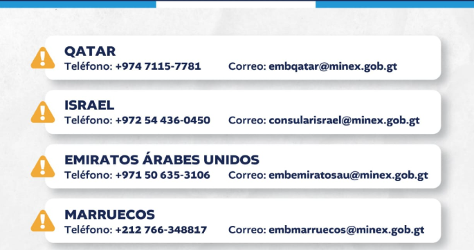 El Minex reconoce la importante labor que lleva a cabo los funcionarios diplomáticos guatemaltecos desplegados en el Oriente Medio. Además, recuerda los números de emergencia de las representaciones diplomáticas en esa región:
