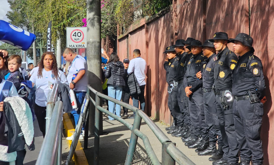 Para garantizar el desarrollo adecuado del partido, el perímetro del Estadio Manuel Felipe Carrera se mantiene totalmente resguardado por agentes de la Policía Nacional Civil (PNC). Los alrededores permanecen cubiertos con presencia policial, quienes velarán por el orden antes, durante y después del encuentro.