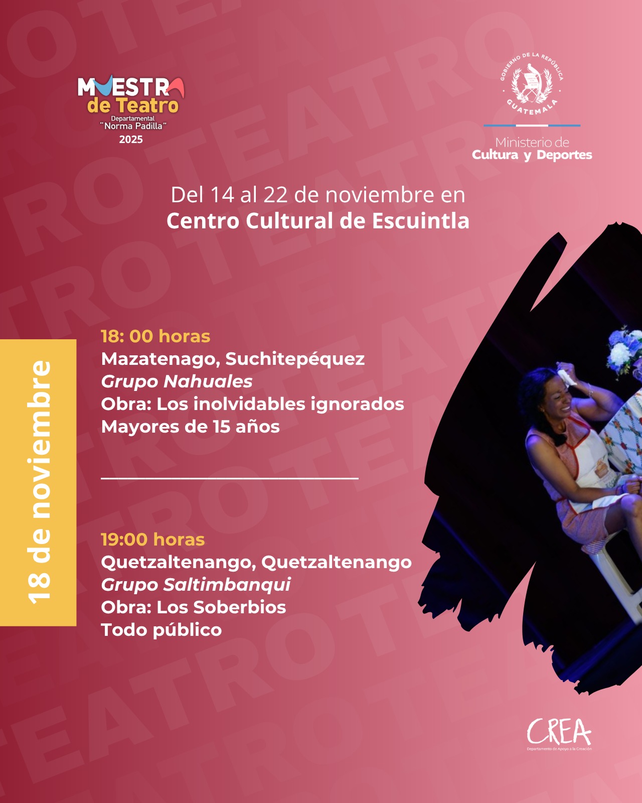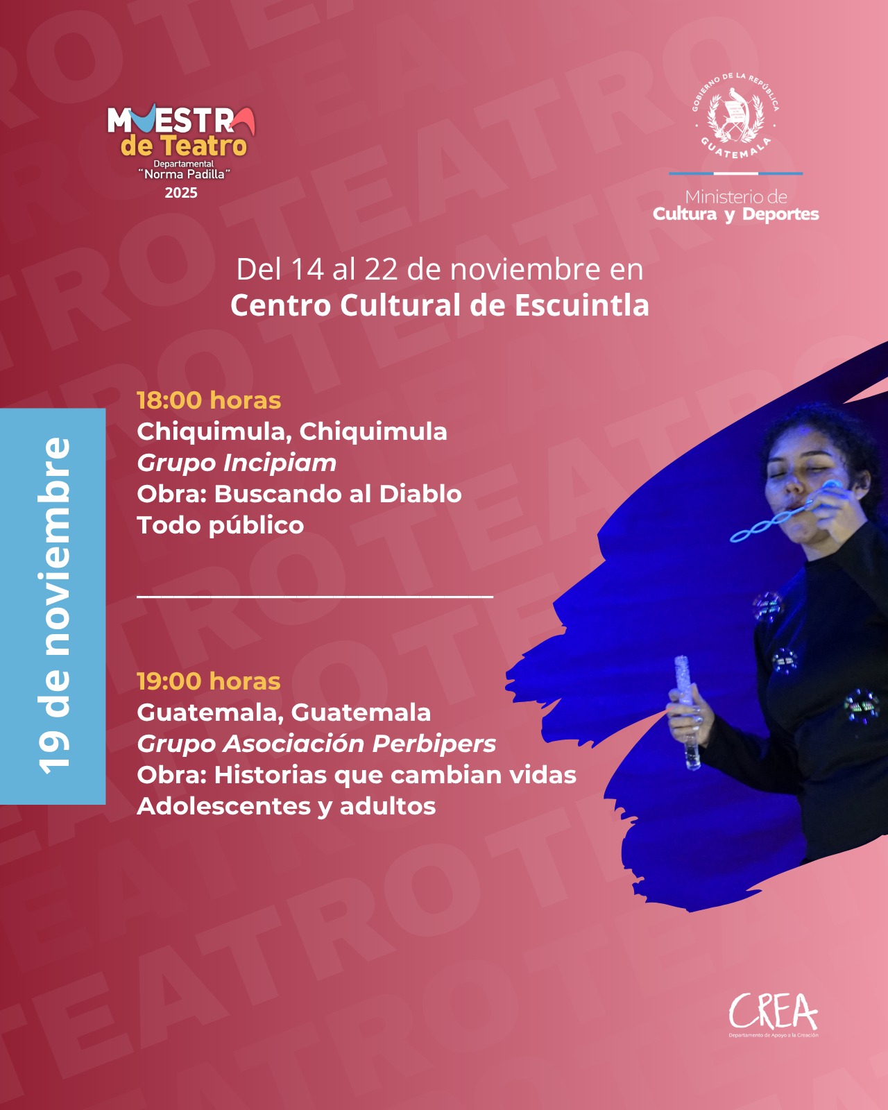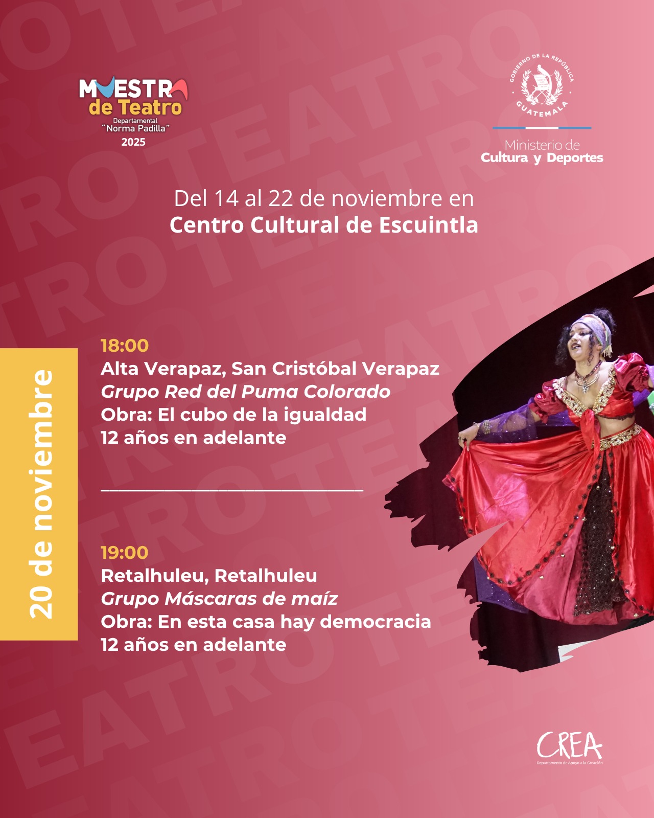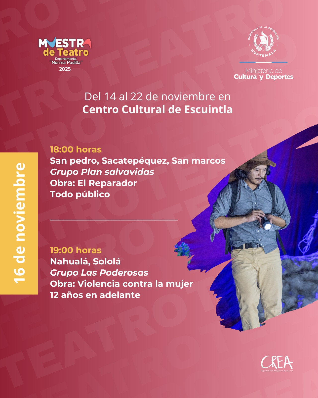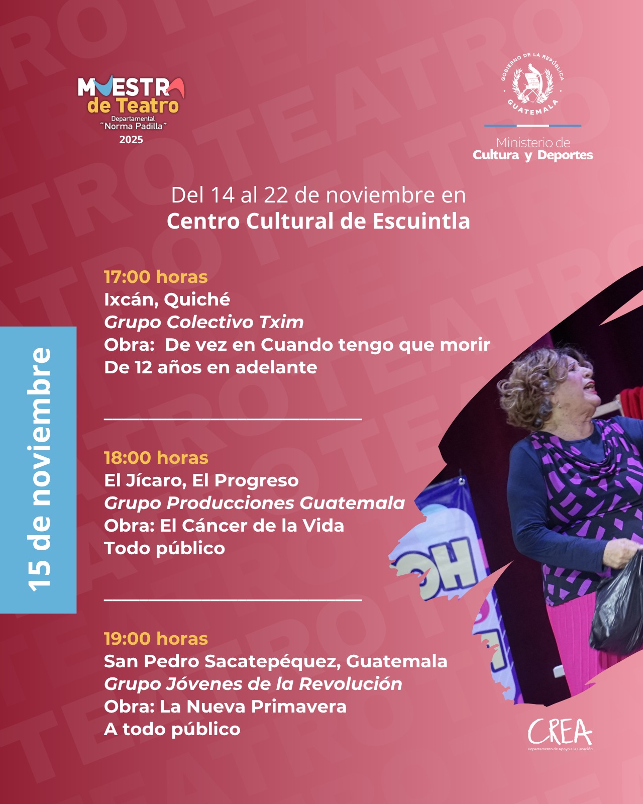 Escuintla, 10 nov (AGN).- Escuintla se prepara para vivir una de las celebraciones artísticas más esperadas del año: la Muestra de Teatro Departamental Norma Padilla, que en esta edición tendrá lugar en el Centro Cultural de Escuintla. A pocos días de su inauguración, el ambiente teatral ya se hace sentir, con la participación de elencos provenientes de distintos puntos del país.