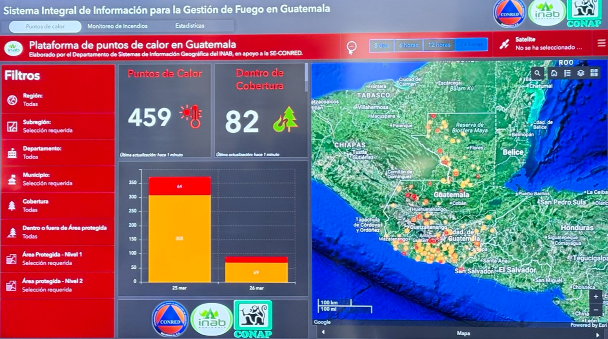 Ciudad de Guatemala, 7 abr (AGN).- El monitoreo de incendios forestales en Guatemala avanza gracias al uso de tecnología satelital y sistemas de información geográfica implementados por el Instituto Nacional de Bosques (Inab) en las denominadas pantallas de fuego.