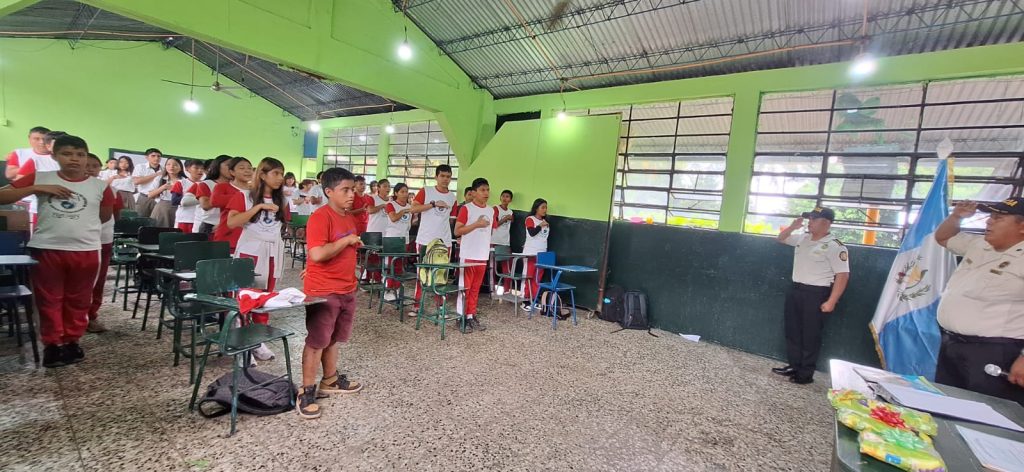 Durante la actividad, los delegados de prevención del delito, a bordo de la unidad policial, compartieron con los estudiantes de tercero básico, secciones A y B, reforzando valores como el respeto, la convivencia pacífica, la responsabilidad y la resistencia ante las pandillas y la violencia.