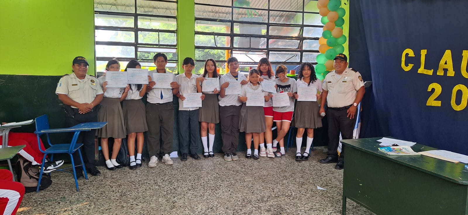 Suchitepéquez, 7 nov (AGN).– La Subdirección General de Prevención del Delito, a través de la Delegación Departamental de Relaciones Comunitarias de la Comisaría 33 de la Policía Nacional Civil (PNC) de Suchitepéquez, realizó la clausura del programa GREAT (Educación y Entrenamiento en Resistencia a las Pandillas) en el Instituto de Educación Básica por Cooperativa de la Colonia Bilbao, en el municipio de Mazatenango.