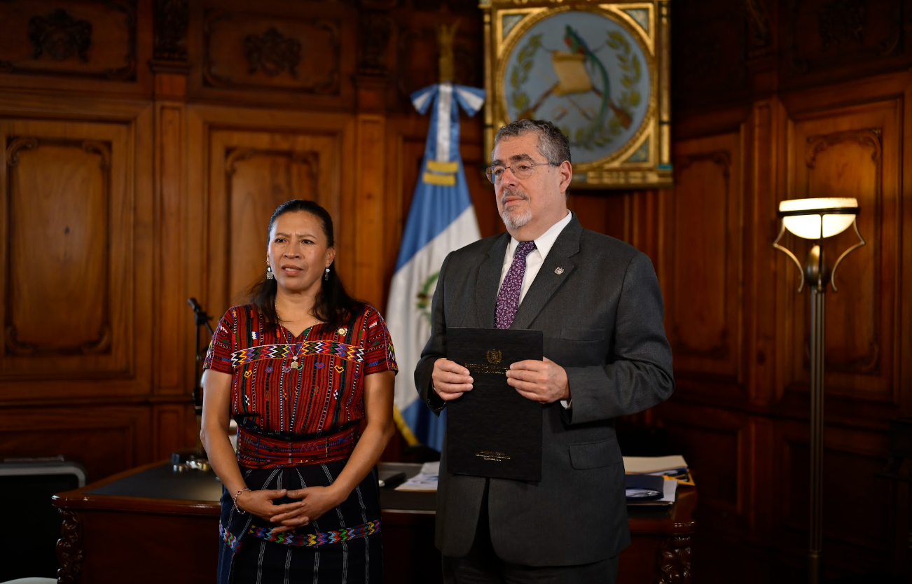 Presidente Bernardo Arévalo y ministra de Trabajo, Miriam Roquel, en el anuncio de los salarios mínimos para el 2026. / Foto: Álvaro Interiano.