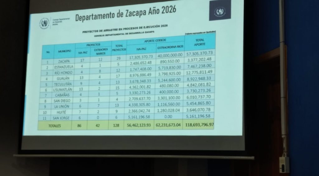 Carlos Pérez, director ejecutivo del Codede, presentó los proyectos de desarrollo que se priorizarán y se tomarán en cuenta para realizar de la mano los planes del ejercicio fiscal 2026. Informó que son 128 los proyectos de arrastre que se ejecutarán en 2026 con un aporte total de 118 millones 693 mil 796 quetzales con 97 centavos para el departamento.