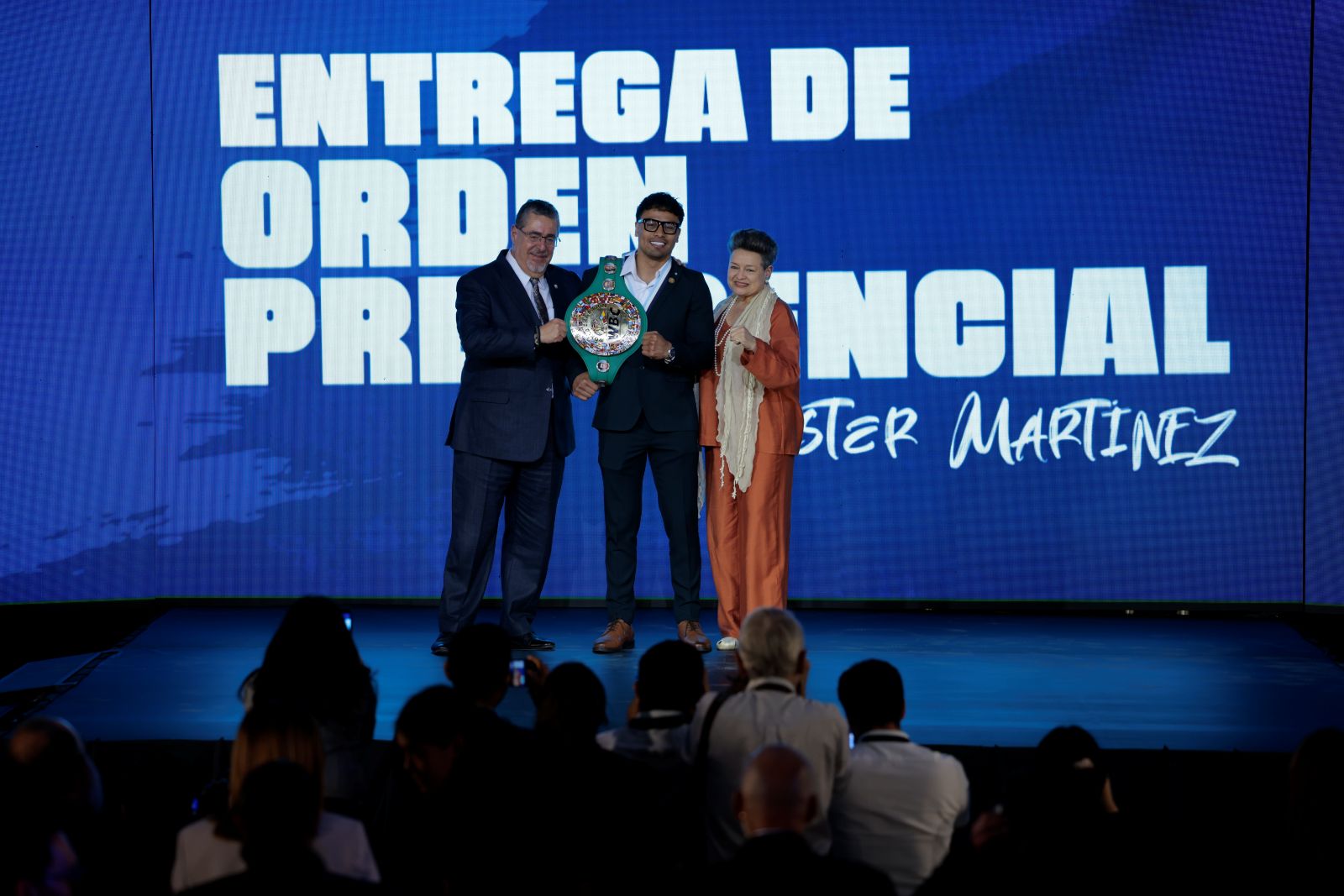 El boxeador, originario del municipio de San Benito, Petén, lució la medalla presidencial del Gobierno guatemalteco junto con el cinturón de Campeón Mundial Interino del CMB.