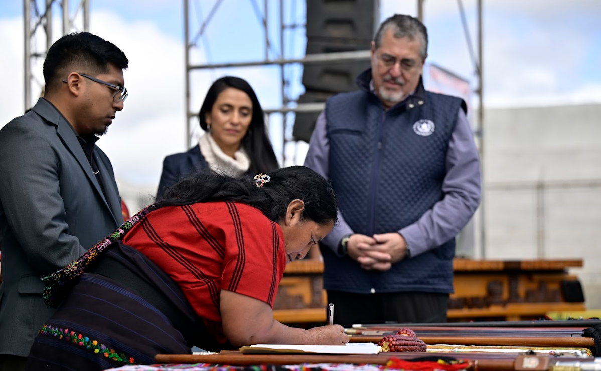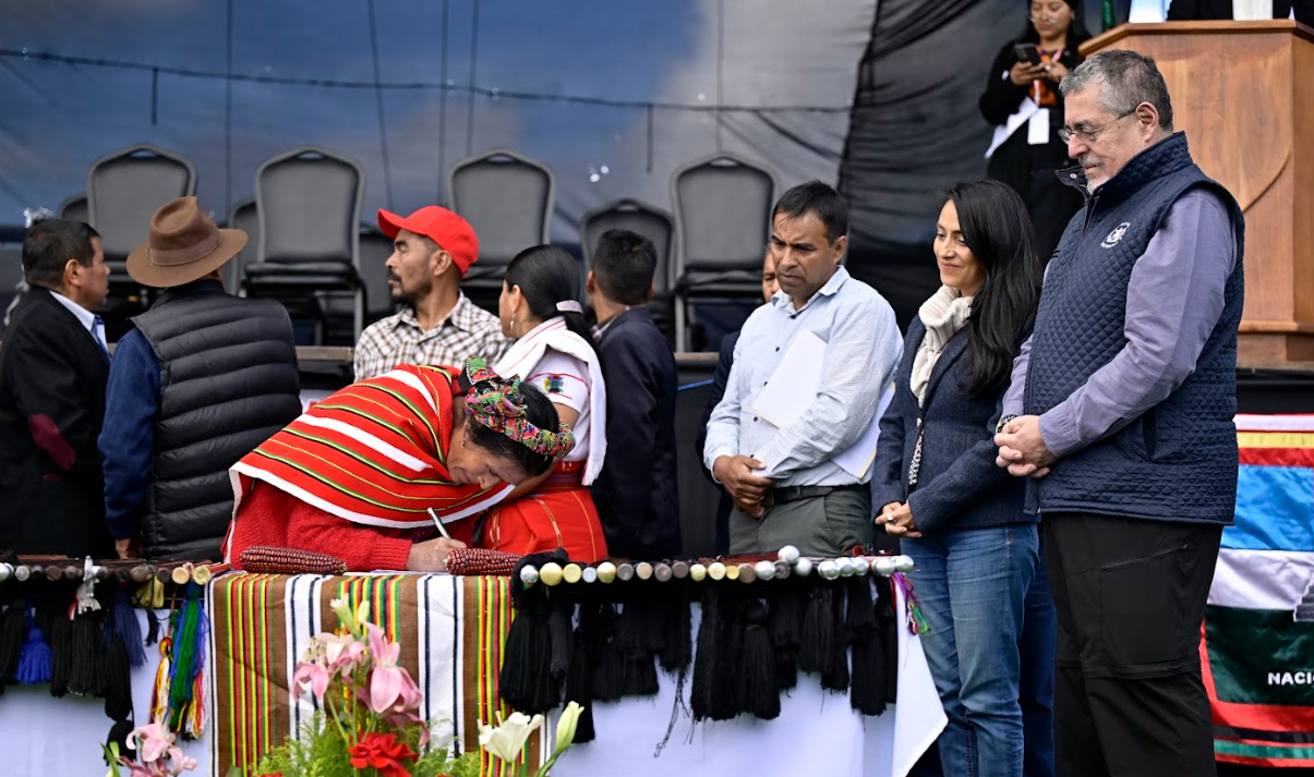 Ciudad de Guatemala, 27 nov. (AGN).- El presidente Bernardo Arévalo junto a la subsecretaria Privada de la Presidencia, Mónica Mazariegos, firmaron la Agenda Territorial con el Pueblo Mam, en el municipio de Cabricán, Quetzaltenango.