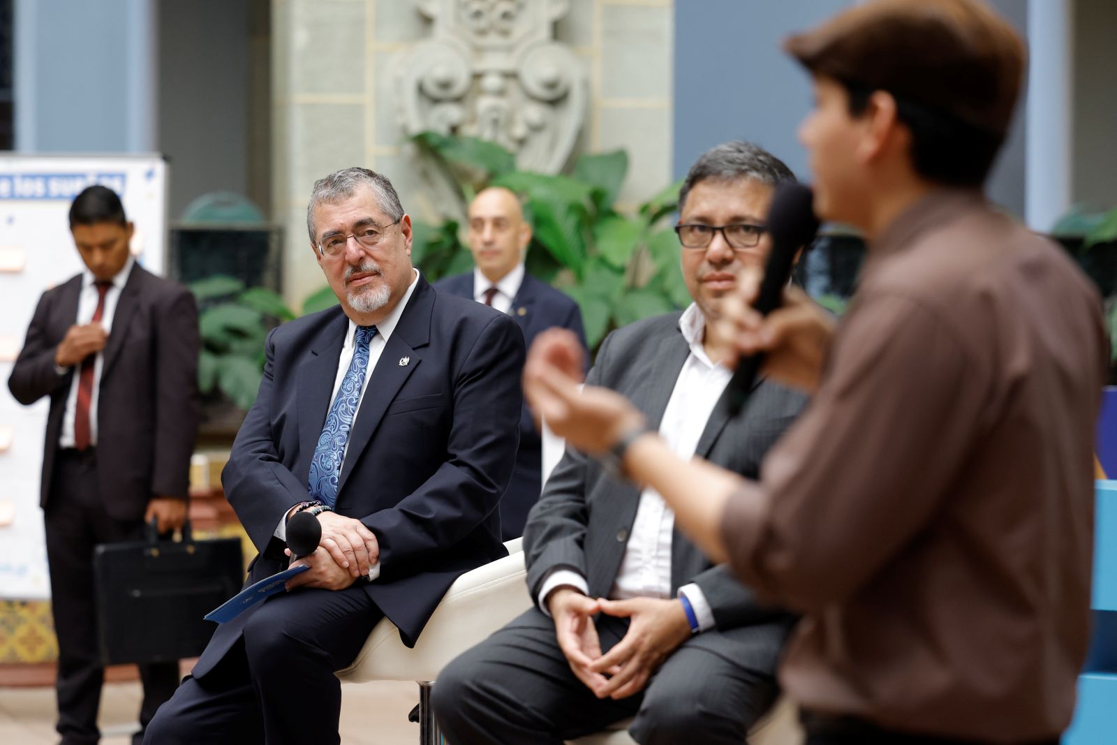 El presidente Bernardo Arévalo y el titular de Segeplan, Carlos Mendoza, escuchan el testimonio de un joven beneficiario del programa Becas por nuestro futuro.