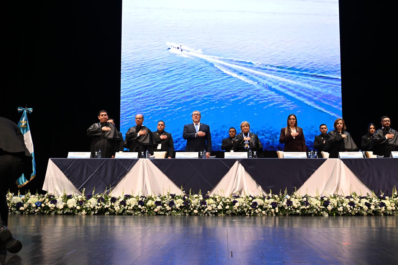 En la mesa principal, el presidente Arévalo y la presidenta del Organismo Judicial, Claudia Paredes, acompañaron a los magistrados titulares del TSE, como parte del acompañamiento de los poderes del Estado a los nuevos togados elegidos previamente por el Congreso.