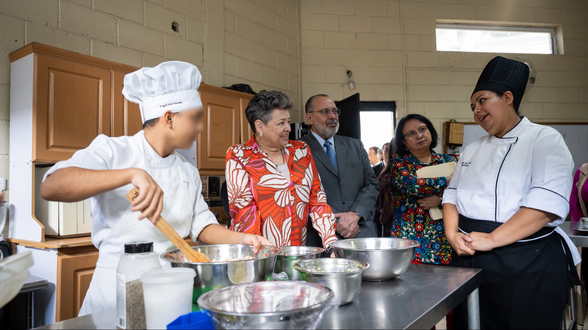 Ciudad de Guatemala, 12 dic (AGN).- La doctora Lucrecia Peinado, primera dama de la Nación, recorrió el Centro de Capacitación Ocupacional (CCO), de la Secretaría de Bienestar Social de la Presidencia (SBS), donde constató la atención integral que reciben adolescente de 14 a 18 años con discapacidad intelectual leve o moderada, quienes se forman en oficios como repostería, panadería, cocina y conserjería.