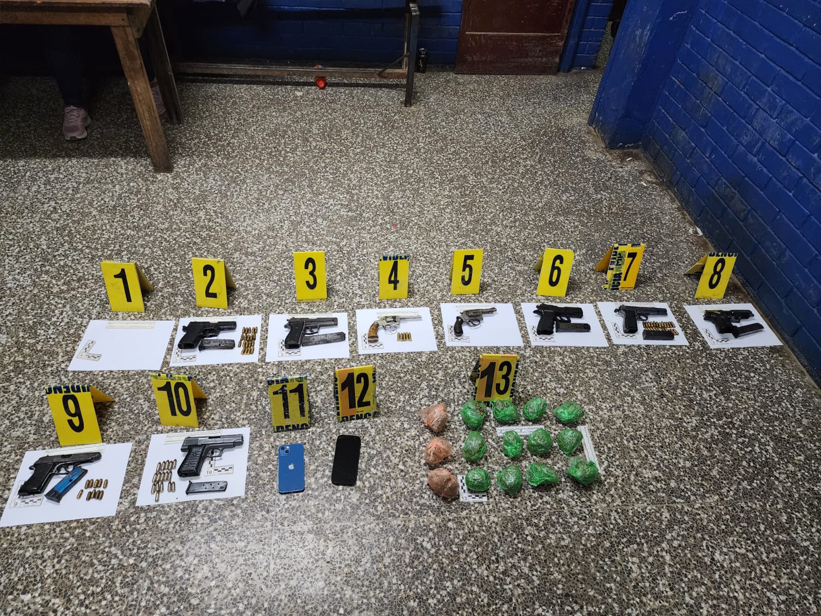 Durante la intervención, las autoridades localizaron diversos objetos prohibidos, entre ellos armas de fuego, municiones, dispositivos de comunicación y posibles sustancias ilícitas.