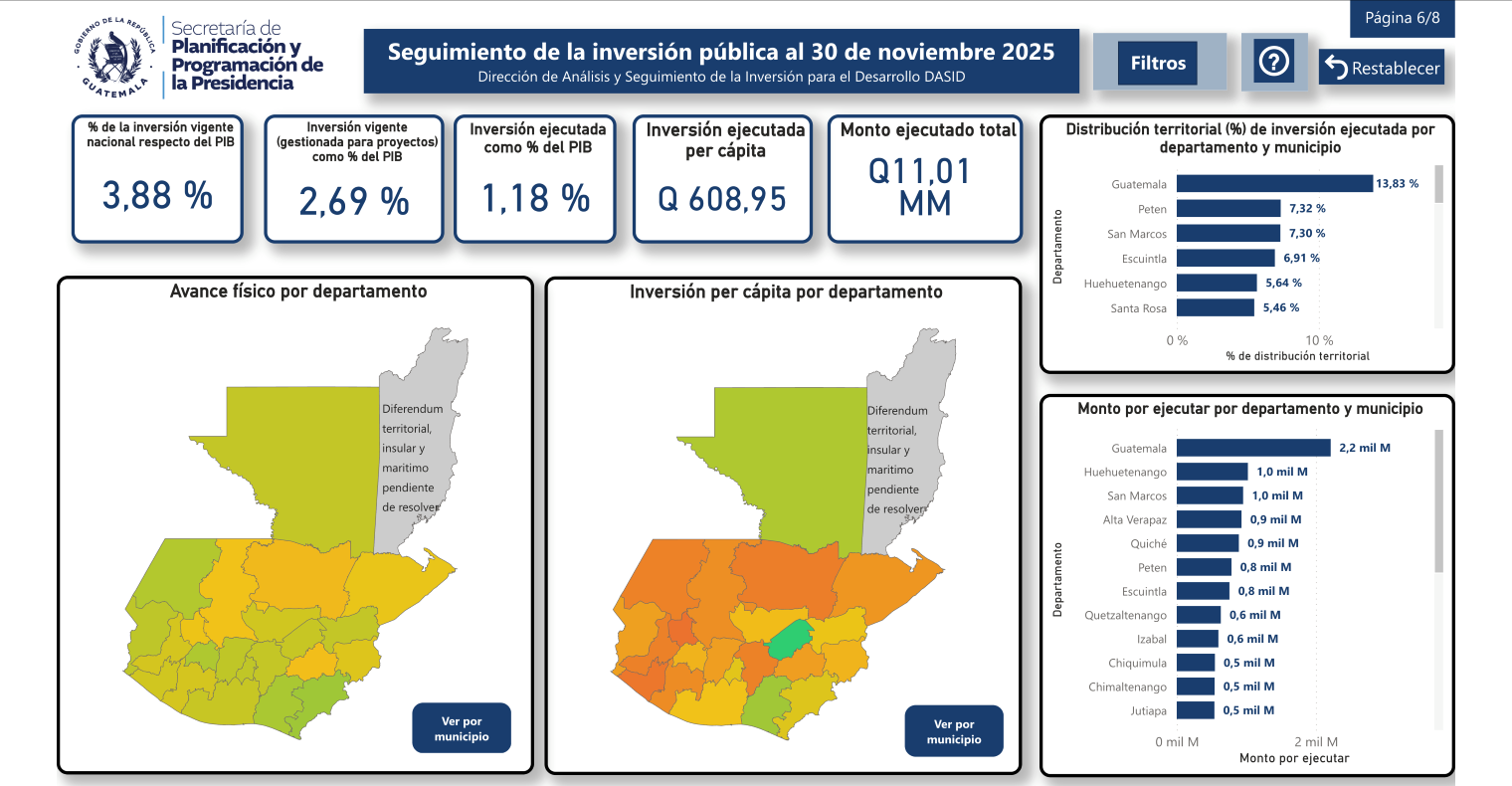 Toda la información que se encuentra en el tablero proviene del Sistema de Contabilidad Integrada (Sicoin), el Ministerio de Finanzas Públicas (Minfin) y el SNIP.