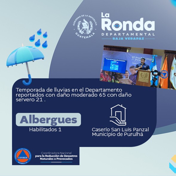 De esa cuenta, el representante de Conred presentó las recomendaciones para la temporada de lluvias, resaltando la importancia de la prevención comunitaria. Durante este mes se reportaron más de 86 incidentes con daño severo y moderado ocasionados por las fuertes lluvias. Además de la habilitación de un albergue en el caserío San Luis Panzal, Purulhá, para resguardar a las familias afectadas.