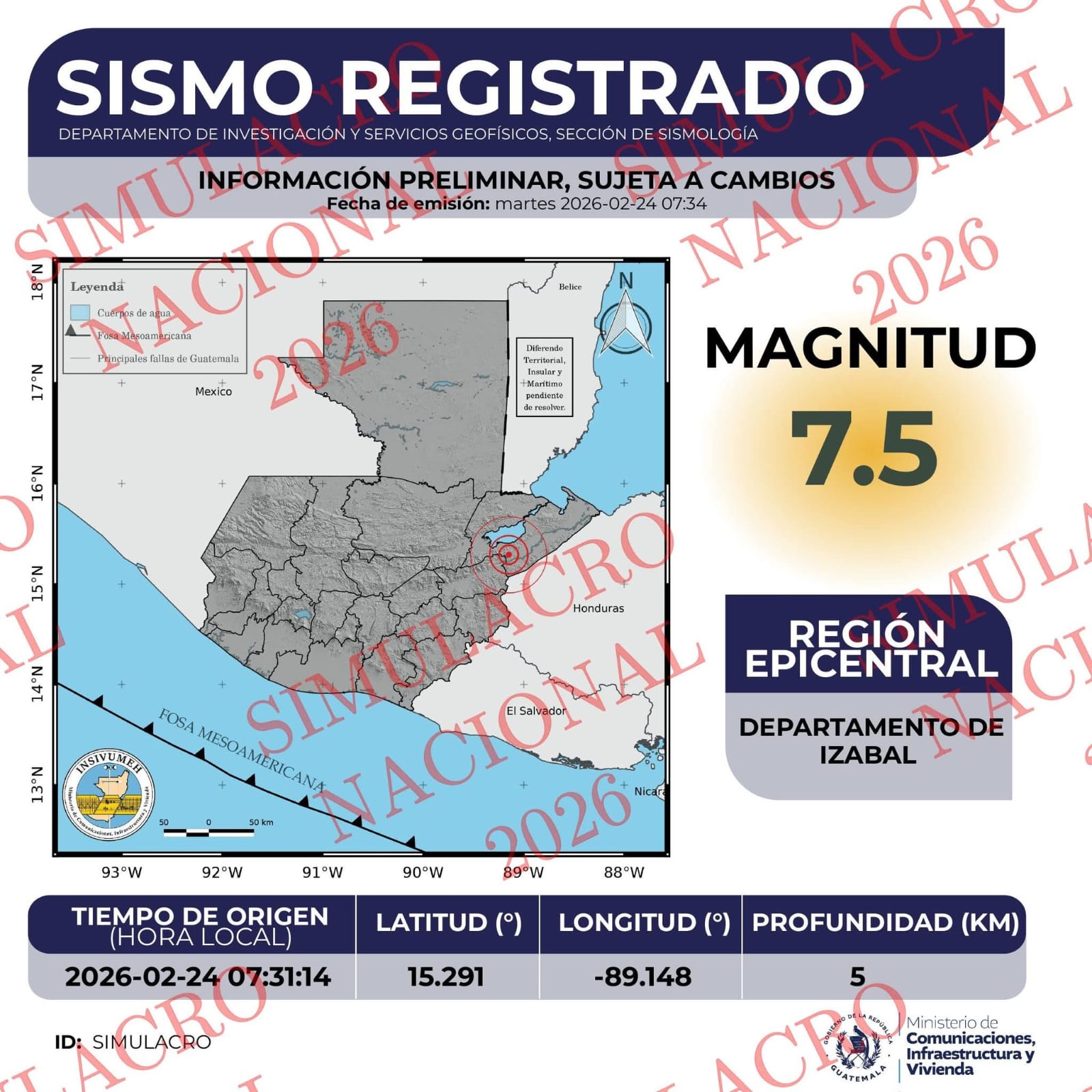 Ciudad de Guatemala, 24 feb (AGN). – Un sismo de 7.5 grados de magnitud se produjo hace unos minutos con epicentro en Izabal, reportó el Instituto Nacional de Sismología, Vulcanología, Meteorología e Hidrología (Insivumeh). Estas acciones son parte del simulacro programado por las autoridades por la conmemoración de los 50 años del terremoto de 1976.