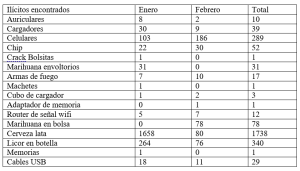 En materia de drogas, las autoridades reportaron el hallazgo de 31 envoltorios de marihuana en enero, 78 bolsas de marihuana en febrero y una bolsita de crack.