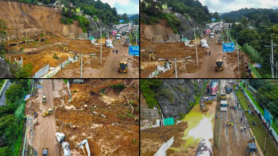 Inmediatamente, Covial coordinó el traslado de maquinaria pesada para la remoción del material del derrumbe que cubrió los cuatro carriles de la vía, sin embargo, la persistencia de lluvias, agrietamientos en la ladera y más desprendimientos de tierra dificultaban los trabajos.