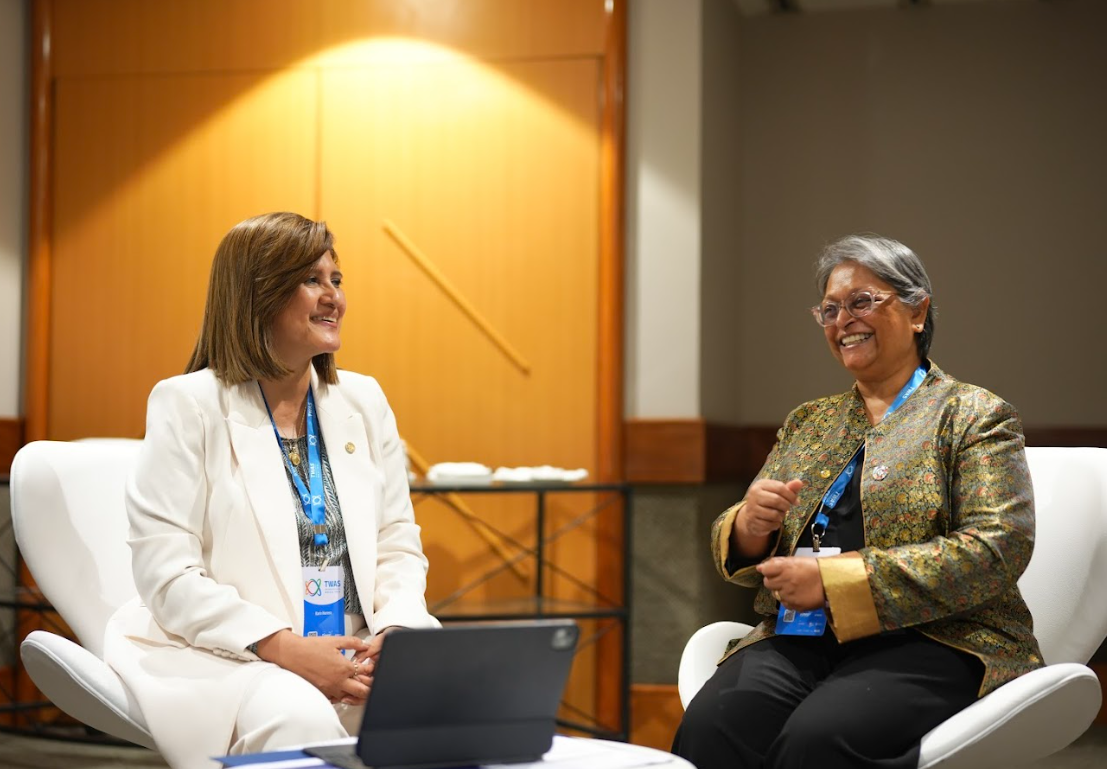Uno de los encuentros fue con Quarraisha Abdool Karim, presidenta de la Academia Mundial de Ciencias, en donde ambas intercambiaron experiencias con el fin de que más jóvenes tengan acceso al conocimiento científico y puedan impulsar el desarrollo en sus comunidades.